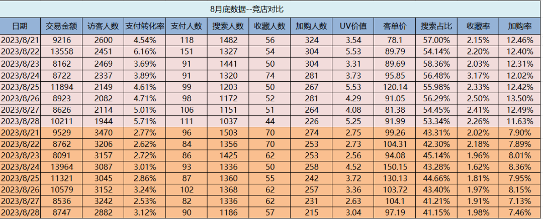 “了解競店的爆款產(chǎn)品,進(jìn)行數(shù)據(jù)對比。因?yàn)楦鱾€(gè)店鋪結(jié)構(gòu)的不同,我們會進(jìn)行對應(yīng)的改變,使用差異化競爭?!惫鉃嬖V我們,“每周競店數(shù)據(jù)進(jìn)行對比,持續(xù)感知競店的實(shí)時(shí)動向,避免運(yùn)營品牌店鋪被超越。”